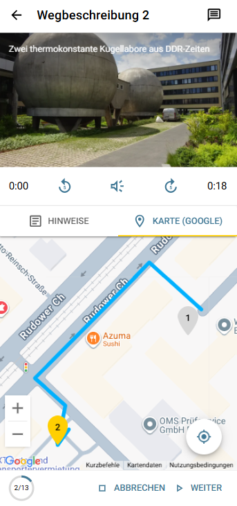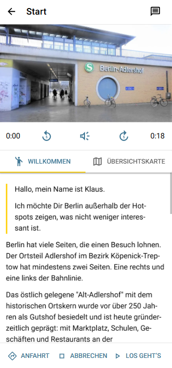 - Um die Tour zu starten, ist eine Internetverbindung erforderlich. Die Tour wird automatisch heruntergeladen und kann dann offline genutzt werden. Während der Tour wird eine Internetverbindung nur benötigt, wenn man die Verlinkungen zu weiteren Informationen nutzen möchte. Eine Internetverbindung wird jedoch während der Tour empfohlen, um die in die Tour integrierte Karte (Google Maps) interaktiv nutzen zu können (z.B. für die Zoomfunktion). Die Karte ist auch im Offline-Modus verfügbar, ist dann aber nicht interaktiv.
