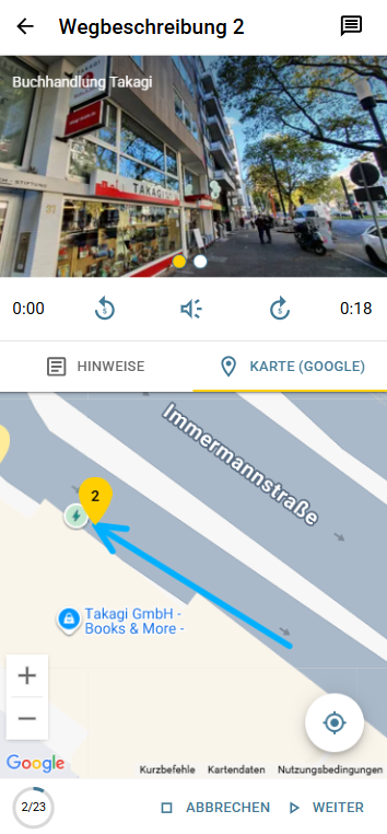 - Um die Tour zu starten, ist eine Internetverbindung erforderlich. Die Tour wird automatisch heruntergeladen und kann dann offline genutzt werden. Während der Tour wird eine Internetverbindung nur benötigt, wenn man die Verlinkungen zu weiteren Informationen nutzen möchte. Eine Internetverbindung wird jedoch während der Tour empfohlen, um die in die Tour integrierte Karte (Google Maps) interaktiv nutzen zu können (z.B. für die Zoomfunktion). Die Karte ist auch im Offline-Modus verfügbar, ist dann aber nicht interaktiv.