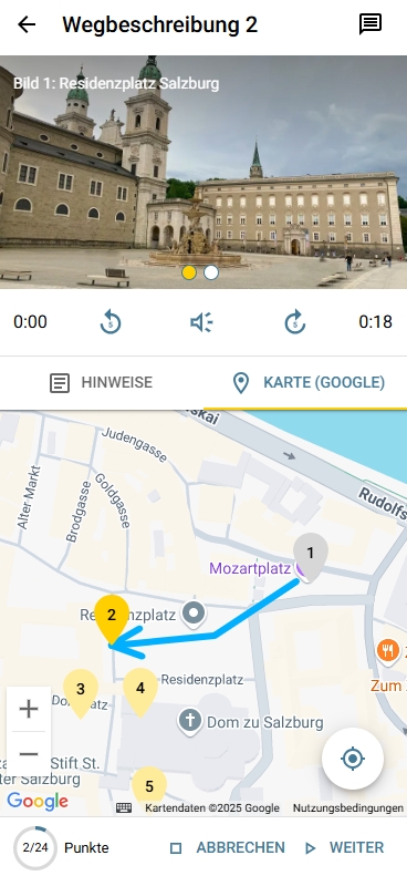 - Um die Tour zu starten, ist eine Internetverbindung erforderlich. Die Tour wird automatisch heruntergeladen und kann dann offline genutzt werden. Während der Tour wird eine Internetverbindung nur benötigt, wenn man die Verlinkungen zu weiteren Informationen nutzen möchte. Eine Internetverbindung wird jedoch während der Tour empfohlen, um die in die Tour integrierte Karte (Google Maps) interaktiv nutzen zu können (z.B. für die Zoomfunktion). Die Karte ist auch im Offline-Modus verfügbar, ist dann aber nicht interaktiv.